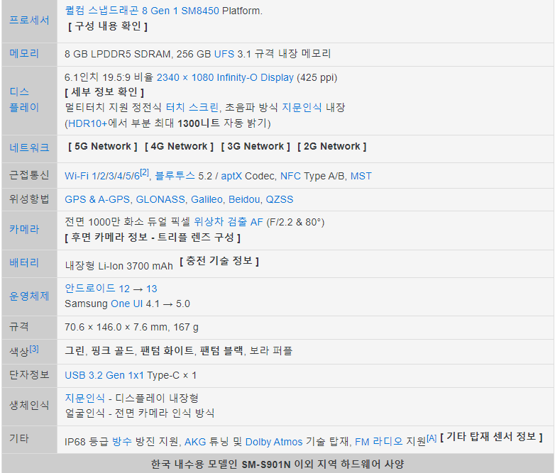 | S23 | 2340x1080 | FHD+플랫 디스플레이 | 5.26cm(6.01") | D-AMOLED 2x | 1,750니트 | 48~120Hz |