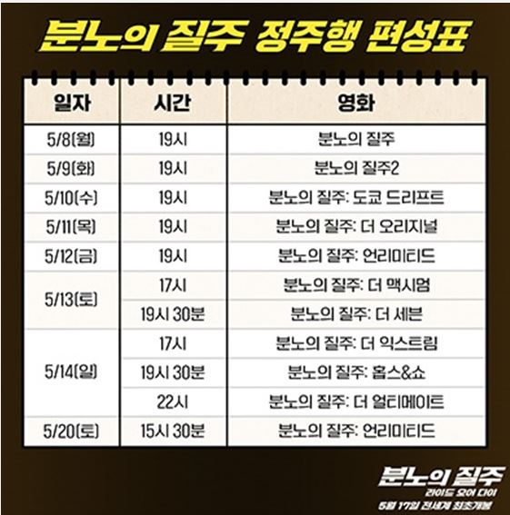 OCN은 분노의 질주 시리즈를 편성, 8일 오후 7시 분노의 질주(2001)를 시작으로 매일 한편씩 방영 예정입니다.
