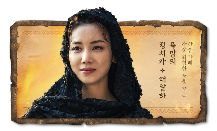 아버지 미홀로 인해 산웅과 타곤 사이에서 오랫동안 첩자 노릇을 하다 아버지를 죽이고 연인인 타곤을 선택합니다. 하지만 타곤과 태알하는 서로를 바라지만 서로를 믿지 못하는 아슬아슬한 관계가 되어갑니다. 태알하는 아스달 최초의 왕후가 되어 권력의 정점에 서게 되는데 이제 더 이상 타곤의 마음을 훔쳐 세상을 지배할 생각은 없습니다. 스스로 가장 높은 곳에서 통치할 욕망을 꿈꾸게 됩니다.