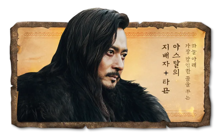 천재적인 전략가이며 모든 사람들에게 인정받고 싶어 하는 인물이었으나 흰산족의 반란을 계기로 이그트임을 들킨 이후 스스로 왕이 되기를 꿈꾸며 잔혹한 숙청을 이어나갑니다. 아사신의 직계 후손인 탄야를 이용하여 자신이 아라문 해슬라의 재림이라고 말하며 아스 대륙 최초의 국가인 아스달의 왕이 되고 어릴 적부터 사랑했던 태알하와의 사이에서는 아이가 태어나게 됩니다.